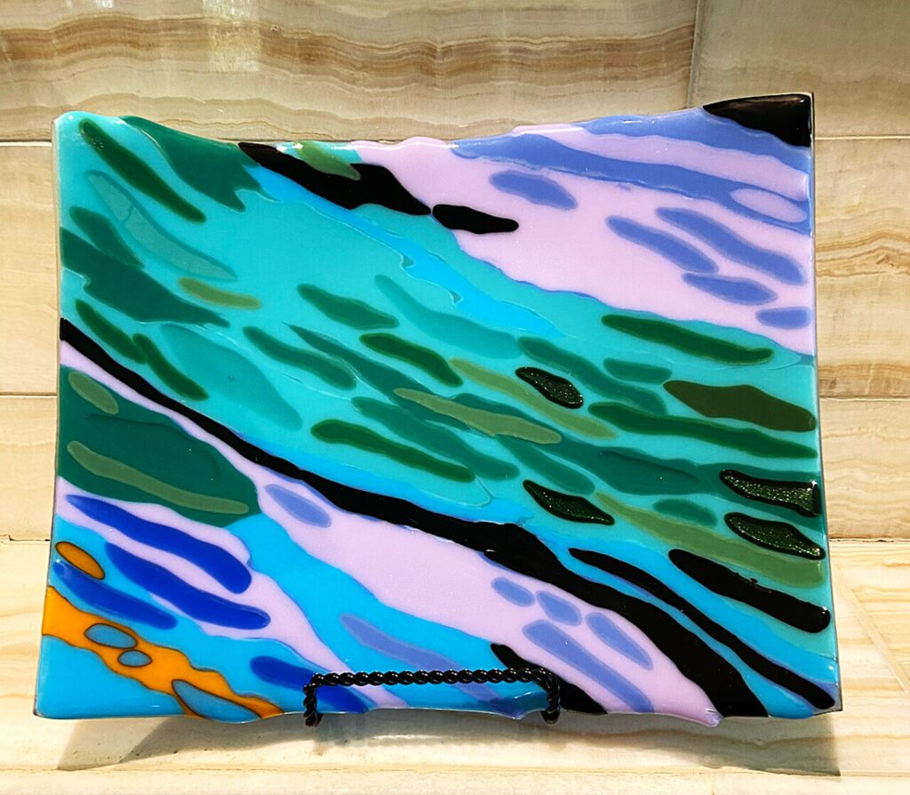 Barb Mueller crafts luminous fused glass art that captures light, color, and nature’s energy. Layering vibrant powders, frits, and sheets, she creates depth and movement in abstract and realistic styles—painting with glass.
