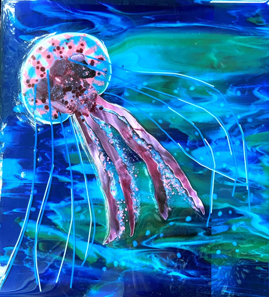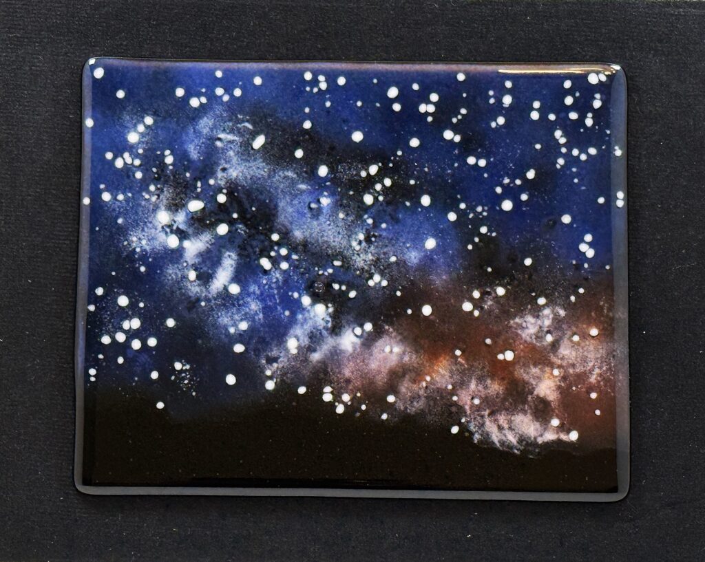 Her 2-D framed pieces showcase seasonal landscapes and celestial wonders: swirling nebulas, galaxies, auroras, and glowing vistas that shift beautifully in changing light. In 3-D, she offers contemporary vases, patterned dishware, vessels, and sculptures. The “Coastline” series, inspired by NASA phytoplankton blooms, features vibrant flowing forms that serve as dishes or tabletop art on stands.