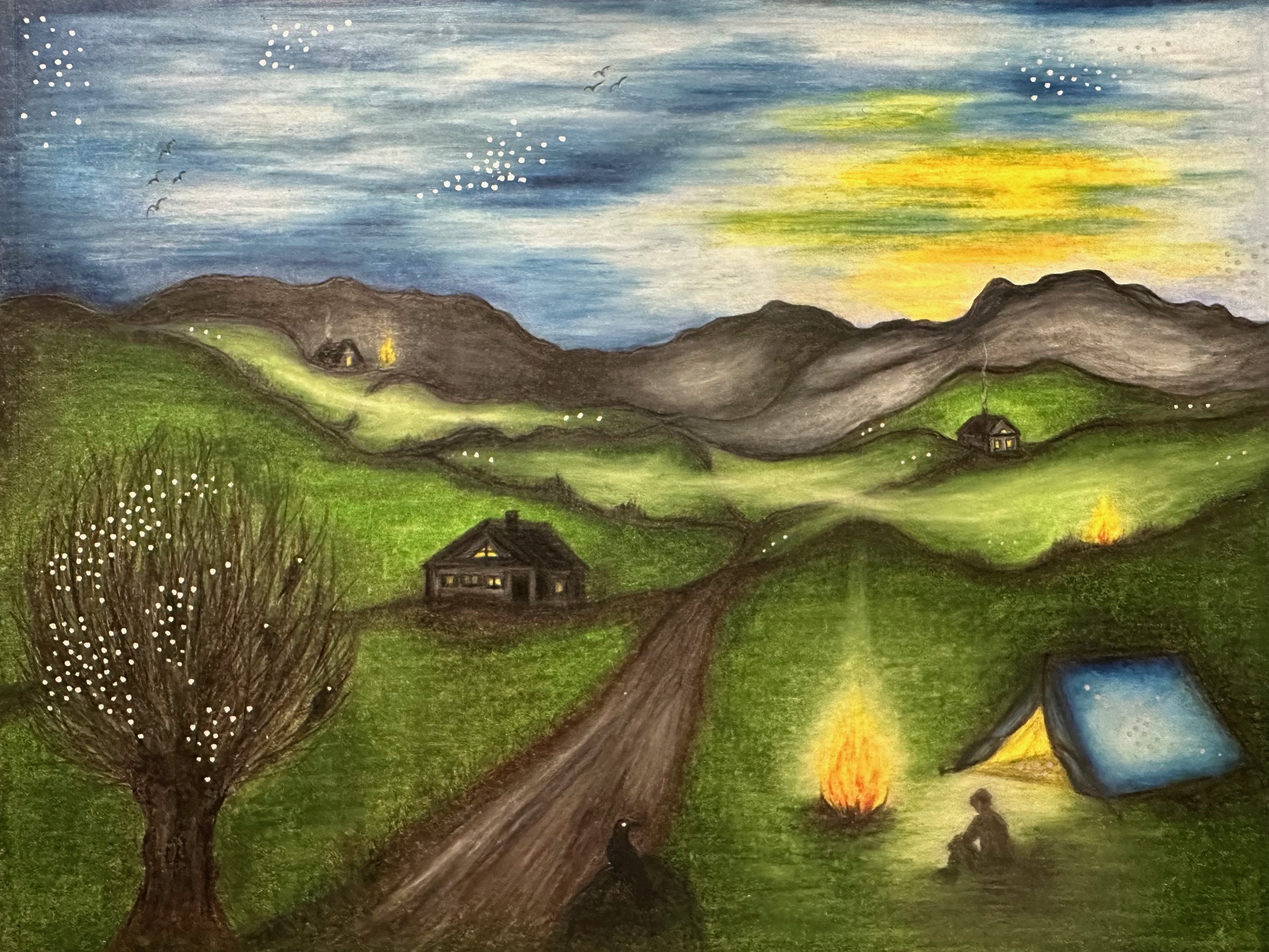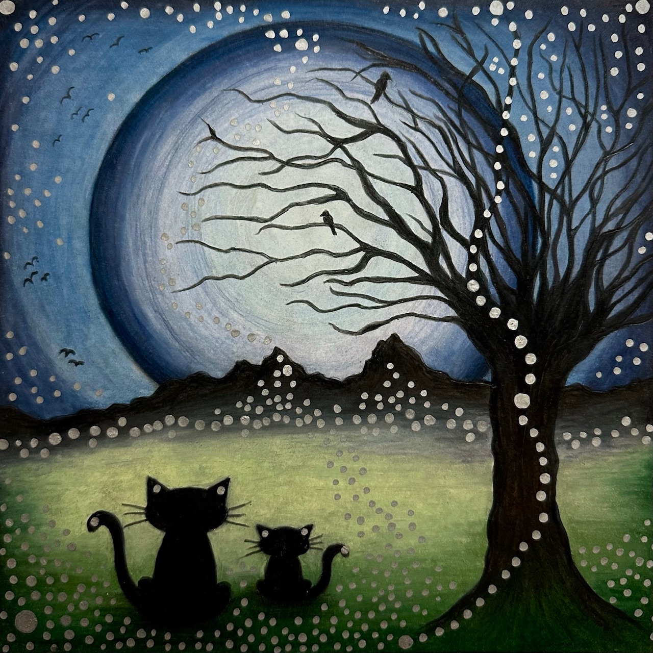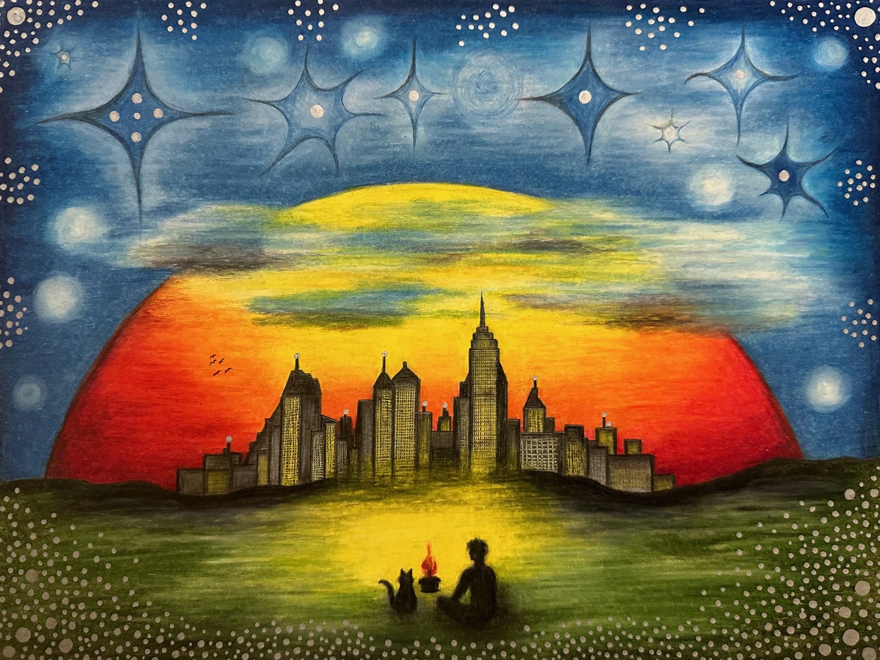 My drawings picture abstract images from my imagination with recurrent motives of spheres and orbs, mandalas, surreal characters and silhouettes, trees, dreamy and mysterious landscapes.
