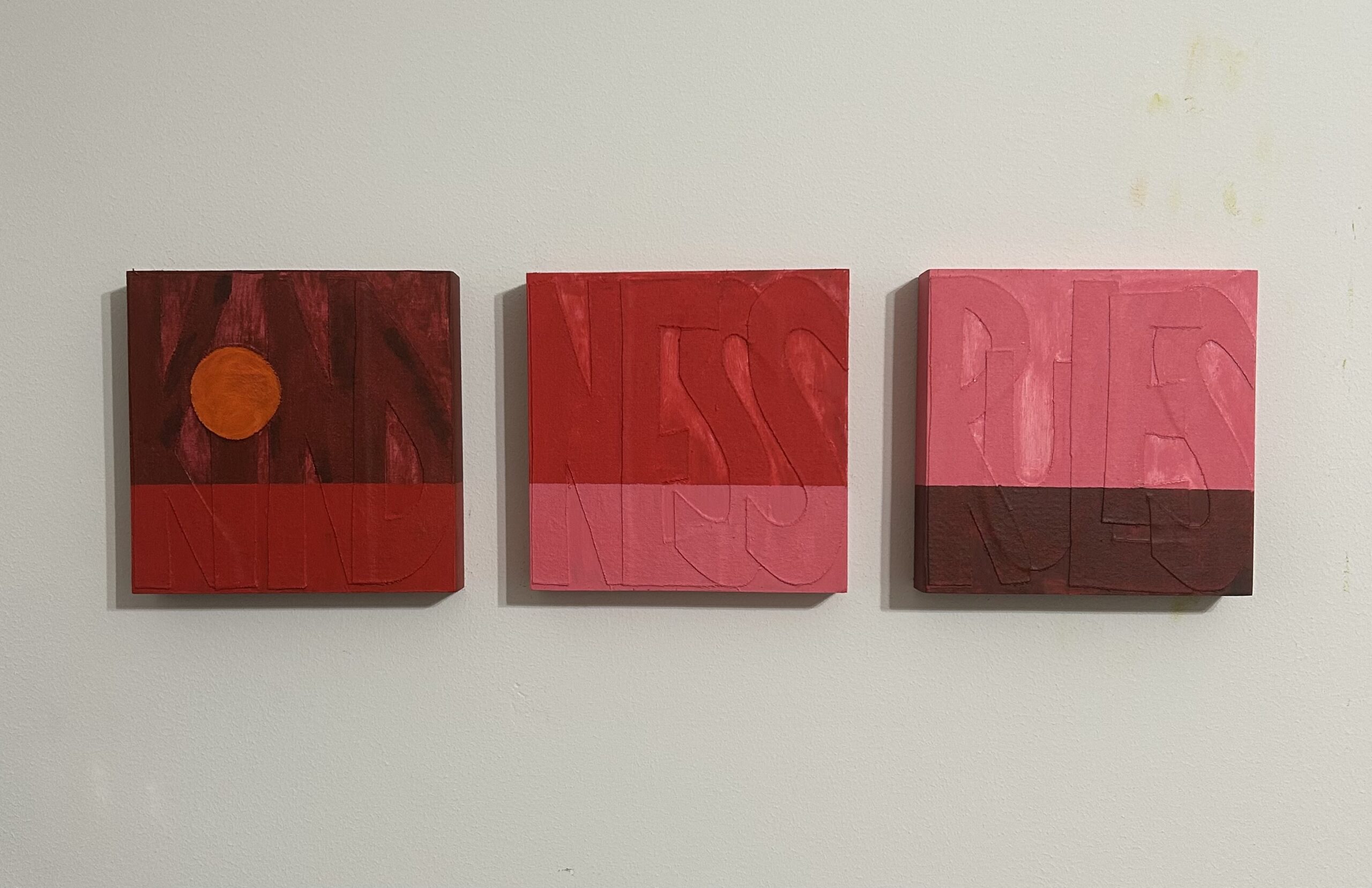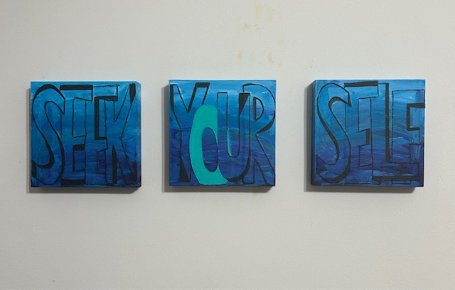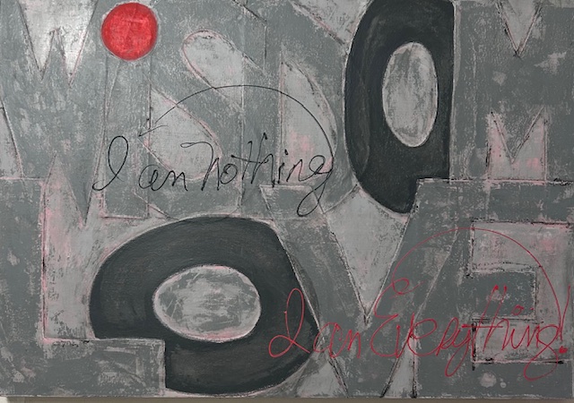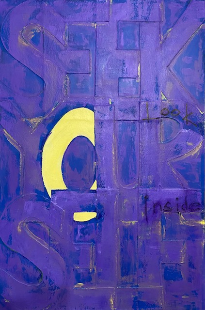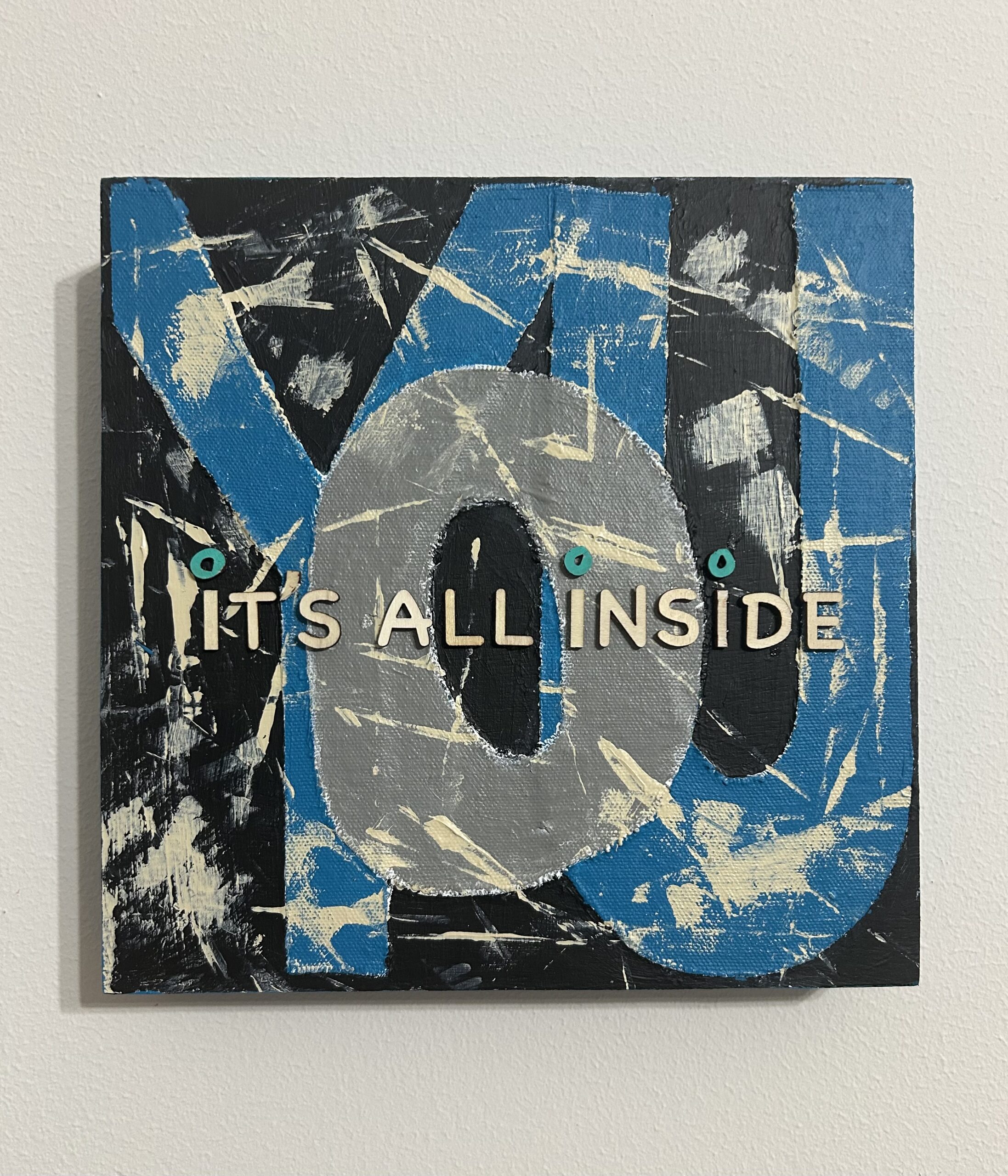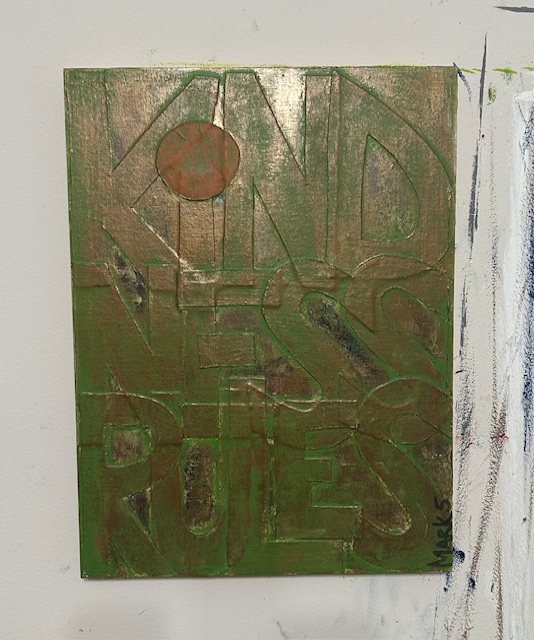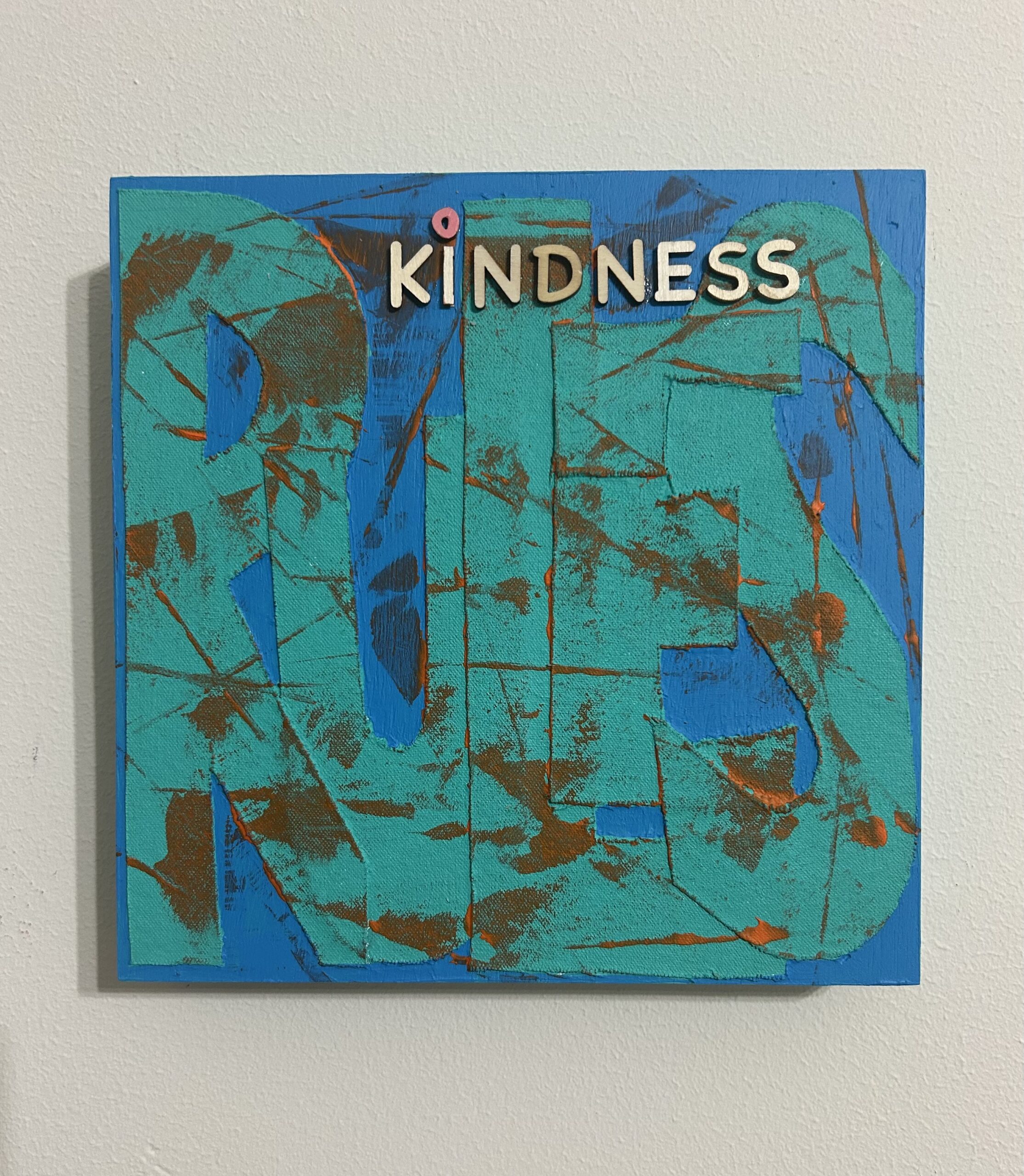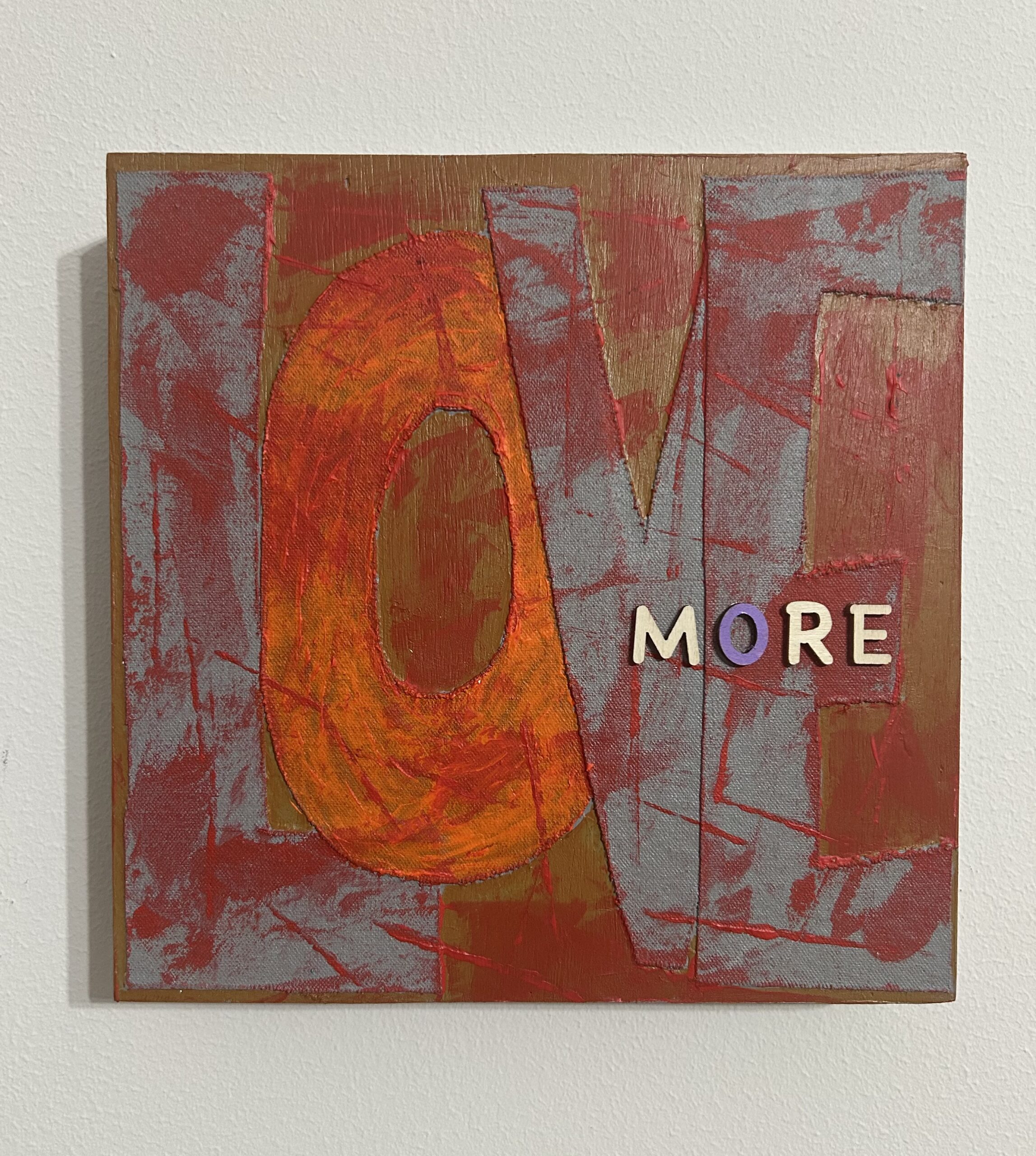 Through a distinctive process of slicing raw canvas into letters and shapes, then reassembling them into textured compositions, Mark creates layered works where meaning is both boldly declared and deliberately concealed. Viewers are drawn into an active search — peeling back abstraction to uncover messages that reflect their own experiences and perspectives.